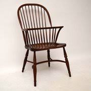 Windsor chairs are still being made in the traditional way today. The enduring strength and popularity of the Windsor design is indicated by the fact that many are still in daily use 200 years after they were made. Most Windsor chairs are bought to furnish traditional homes rather than by collectors and they can represent excellent value for money, with examples of many of the most common types available for tens rather than hundreds of pounds. Connoisseurs look for chairs of unusual or refined design and for pieces in unaltered condition with original finish. Windsor chairs were made in a large range of styles but the traditional English forms tend to be either comb- or hoop-backed with a central decorative splat. For comb-backed chairs, the upright spindles that form the backrest are socketed into a simple bar at the top. In hoop-back chairs the uprights are anchored by a bent arch of wood which is jointed into the seat or the arms. The arms are generally formed from a single length of wood bent into a bow.