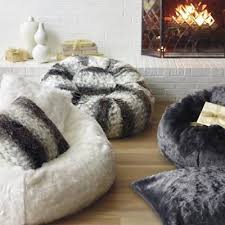 The sheepskin beanbag above is a good example. From Cox & Cox in England, this is the softest thing imaginable: " Made from supersoft 100% sheepskin that has been carefully manufactured in the UK, this large, long pile soft white beanbag exudes luxury. With a soft grey non slip suede leather base, zip closure and generously filled with beans." For more choices, head below! Longwool Sheepskin Beanbag Chair Here's a US source for a very similar bag like that one on top. Originally discovered at Thomas O'brien's Aero in NYC, this Texas based company makes both short and long wool bags in large and jumbo. Check out the pic below. (Image credit: Celeb TX) (Image credit: Little Red Stuga) Kebnekaise Pouf - €177 Made of 100% organic cotton, Kebnekaise is a knitted pouf and the highest mountain in Sweden at 2100 m (situated in the north of Sweden). Don't just sit down, climb a mountain! (Image credit: PB Teen) Ivory Furlicious Faux Fur Beanbags - $89 From PBTeen a super affordable faux fur hangout zone.
