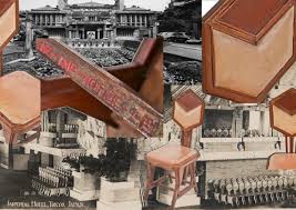 the side chair is comprised largely of oak wood, with original varnished finish. the faded oil cloth upholstery (originally a salmon pink) is likely original to the chair. the underside contains "property of imperial hotel" in an old red paint finish. the original imperial hotel in tokyo was completed in 1890, backed by key japanese leaders, including foreign minister count inoue kaoru and viscount shibusawa eiichi. architect yuzuru watanabe designed the hotel, known as "watanabe house," in the german neo-renaissance style. french cuisine was the official banquet fare of the imperial palace, and the imperial hotel followed that tradition. by 1917, the hotel was no longer able to accommodate the growing number of visitors, and the design was seen as outdated. to replace the original wooden structure, the owners commissioned a design by frank lloyd wright. watanabe's imperial hotel burned down in 1919. the second imperial hotel, built from 1915-1923, was the best-known of frank lloyd wright's buildings in japan.