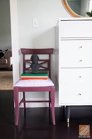 I opened the box to find quite the array of colors to choose from. They were all really lovely, but I thought it might be fun to mix two of them for something a bit different. I’ve been seeing plum in fashion a lot lately and traces of it in the fall leaves the last few weeks. Mixing the Romance and Treasure colors together created a nice, saturated result; so I filled a cup with 1 part Romance and 1 part Treasure and mixed it well with a spoon. I found this chair on the side of the road a few months ago, and had already given it some white primer, originally thinking I would do something lighter with the finish. I’ve read great things about the staying power and coverage of chalk paint. I figured a dark, rich color over a white primer would really test those claims. The first coat showed a lot of the primer, but that’s pretty normal with any paint. As it dried, it did start to smooth out. And after two coats I had complete coverage and this pretty finish with lots of character.