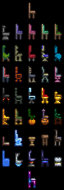 The following is a partial list of chair types, with internal or external cross-references about most of the chairs. Barrel chair, c. 1465, Raversijde, Belgium An example of Elijah's chair, used at Jewish circumcisions A reproduction Glastonbury chair in the Bishop's Palace, Wells High chair by Cosco, 1957 "Pop" (2005), a whimsical variation of a patio chair by the American industrial designer Brad AscalonThe American Heritage Dictionary of the English Language: Fourth Edition. A b is a furniture item that can be placed on the ground. It counts as a comfort item, which is one of the required elements in order to make a House for NPCs. It can also be used as a crafting station under the following conditions: All chairs are 1 block wide, 2 blocks high, and must be placed on top of a solid block or platform. Throne , which also fulfills a House's comfort item requirement. Including the Throne, there are 37 varieties of chair.Found on /r/nosleep, credited to FableForge