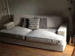 buy barcelona chair canada Light beige slipcovers with skirting protect a furnishing set consisting an ottoman and a club chair.