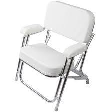 Frame manufactured from aluminum with stainless steel hardware. Detail Relax or fish in complete comfort with the Folding Deck Chair. Great for the boat deck, cockpit, beach, pier, patio or poolside! The boat chair features a cushioned seat, backrest and armrests with UV resistant vinyl. The safety bar locks the chair in place to prevent accidental folding and rubber caps for each leg will not scratch or damage the surface. Simply fold up the heavy duty deck chair for easy transport and storage.