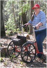 There are tons of nifty mobility devices made for urban environments, such as the one on the left. A rolling walker with 8 inch wheels works fine in town or a paved trail but is dismally hard to push down most trails or even a gravel driveway. There are only a few ready-made devices that actually work well in the great outdoors where surfaces are filled with rocks, grass, tree limbs, furrows, sand and water. * My review of the Walk'N'Chair. Adaptive gear can be as simple as trekking poles for balance and outdoor walking stability. Forearm crutches may be better suited for some types of terrain of mobility issues. Further complicating the selection of mobility devices for outdoor occupations with natural resource agencies are the current federal and state rules on 'vehicles' used on public lands. To be permitted on walking trails and campdrounds, mobility devices must meet two criteria as defined in the Americans with Disability Act: 1) they must be designed solely for use by a mobility impaired person for locomotion, and 2) they must be suitable for use in an indoor pedestrian area.