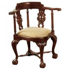 A foam-padded seat is upholstered in beige floral-designed fabric. Wooden chair flaunting a range of classic ambiance with a huge load of decorativeness. This was accomplished particularly thanks to pierced backrest presenting an original detailing. The frame has warm cherry hue, while the seat is padded black. This solid armchair features a durable wooden frame made of solid and stylish mahogany wood. It includes decorative carvings on its legs. A comfortable and soft seat cushion provides good level of relaxation. Set consisting of ten dining chairs which feature appealing classic design and construction made of high quality mahogany wood. Additionally, each piece features stretcher base frame and fine carved details. Beautifully carved in hard mahogany and covered in a walnut finish, this chippendale armchair is a peak of 19th century fashion. It offers ribbon craftsmanship, durable structure, and a stripe patterned fabric on its seat cushion. Crafted of hard mahogany, this unique corner chair is also covered in a slightly distressed finish, and designed in a chippendale style.