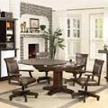 This traditional product has got a round top and a durable wooden construction with a cherry and black finish. It measures 50 x 50.7 x 30 inches. •NEW Optional rubberized floor casters for hardwood floors now available for all game chairs •Available in 42", 48", 54", 60", 66" for 6 or 8 person seating with drink holders in round, octagon or hexagon. •Height: 31" standard •2 in 1 flip top di card table and chairs with casters | Poker Tables - Custom Poker Tables - Poker Tables For Sale Bunk Beds With Desk And Stairs Makeup Table With Mirror And Chair Round Coffee Table With Stools Table With Hidden Chairs Chess Table With Chairs Ikea Glass Table With 4 ChairsJust have to replace the wine glasses with beer bottles and add a poker set and I can totally see the old man here West poker table set with 8 matching chairs | | This piece of furniture is a high quality poker table with four comfortable chairs. The top of this table has got a round shape and all chairs have got caster wheels, solid wooden arms and soft seats with comfortable backrests.