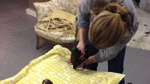 The biggest decision during the reupholstering process is choosing a new fabric. Once you’ve made your selection, this chart shows you how much fabric you will need. A typical sofa uses about 13 yards of fabric and a typical chair uses about 7 yards. Upholstery fabric costs between $20 and $70 per yard or more, depending on quality. So keep in mind the reupholstery of a typical sofa could cost between $260 and $910, or more, for fabric alone. Visit your local Jo-Ann or fabric store and get hands on with the fabric. As you start recovering your furniture, work one section at a time. Line up your new fabric in the piece and use your staple gun to secure it. Make sure there are no gaps and fold and tuck the edges of each piece of fabric to make sure its tight and smooth. Add extra batting and cushioning if needed. Check out the video above to see a professional in action. You can also learn to reupholster is by taking a group class. Students will work on different pieces and everyone learns on multiple types of furniture.