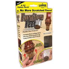 These flexible table leg protectors stretch to fit and will also stop noise when moving chairs around. As Seen On TV Furniture Feet, Large: Flexible floor protectors stretch to fit virtually any chair, stool or table leg Protect floors and the furniture from scratches and scuffs Stops the noise from moving chairs Furniture floor protectors are easy to install Warnings: California Proposition 65 Warning: WARNING: This product contains chemicals known to the State of California to cause cancer and/or birth defects or other reproductive harm Specifications Count 4 Model Finish Brand Is Portable Y Recommended Location Manufacturer Part Number Gender Capacity Age Group Color Assembled Product Dimensions (L x W x H) Videos I need it to go over 1 5/8" diameter of leg. Will it stretch over that? Sign In I need it to go over 1 5/8" diameter of leg. Sign In What size chair leg fits the small size? Sign In I need it to go over a 2 inch square leg.