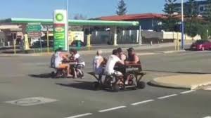 Several videos of the motorised picnic tables were posted on Facebook on Sunday. A police spokesman said the incident was being investigated and that the men in the videos could face a number of charges including driving an unlicensed vehicle, driving an unroadworthy vehicle and drink driving.