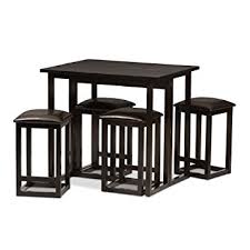 New (10) from $373.76 Baxton Studio Leeds 5-Piece Wood Collapsible Pub Table Set, Brown The smallest of apartments or dining spaces will use the features of the Leeds Dining Set to their fullest. This table and four stool set can be collapsed and set aside with nearly no space wasted: the tabletop folds down as a drop leaf with legs that fold inward also. When collapsed, two stools can fit snugly underneath. Additionally, he stools are backless, allowing the illusion of a larger room. The set is economically constructed with particleboard overlaid with a dark brown wenge veneer made from rubber wood. To clean, wipe with a dry cloth. Overall Dimensions: 35.8-inch H by 31.6-inch L by 39-1/2-inch W. 31.6 x 39.5 x 35.8 inches 0.0 out of 5 stars 110.8 pounds (View shipping rates and policies) Amazon only ships this item within the contiguous 48 United States. Other Sellers on Amazon may ship this item to Alaska, Hawaii and US Territories. This item is not eligible for international shipping.