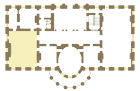 It originally had one fireplace on the east wall, but when the house was rebuilt after the 1814 fire, a second fireplace was added on the west wall, which required that the two west windows be blocked, although new windows were eventually cut to open the space to the conservatories.
