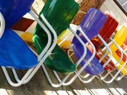 View the Naples Collection Middletown Patio Chaise Lounge with Chili CushionsEvery few years or so, metal lawn chairs, occasional tables, and gliders that are powder-coated in assorted colors become popular again. Perhaps a retailer features them in a new catalog, they are pictured in an ad for some other product or company, or are glimpsed in a movie. Things have a tendency to go in and out of style. Those colorful stamped metal lawn chairs were the ones that Grandma (or Great-Grandma) and her friends would sit and slowly glide in or on while they sipped beverages on the front porch. Later referred to as "motel" chairs for their propensity to show up near pools or outside the front offices of Route 66 motels, most of the originals were allowed to rust and corrode until it was time for them to be sent to lawn chair heaven. Others know these iconic pieces as bouncer, shell-back, clamshell, or tulip chairs. It was after World War II that Ed Warmack, an Arkansas manufacturer and sheet metal fabricator, became the largest producer of gas heaters in the United States.