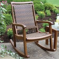 b Wooden rocking chairs are the timeless standard, combining comfort and durability. Some are made from materials such as teak and acacia wood, and can stand up to just about any climate. Whether your tastes lean toward traditional or modern, there is a style of wood rocking chair that’s right for your porch or deck. For instance, a log rocking chair fits right in with a country home. Some feature a naturally charred finish and cured logs that resist mold, mildew and insects. b Weather-resistant rocking chairs offer the ultimate in worry-free relaxation. They are made of Poly-Wood lumber that will not rot, crack or splinter. These rocking chairs can withstand hot summers or frigid winters, and they never need painting. A wicker rocking chair with a heavy-duty steel frame is another durable choice. These often come with oversized seat cushions that repel water and resist fading. You have your choice of sizes, too. You may want a double rocking chair to enjoy the sunset with someone special.