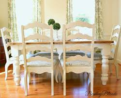 If you follow me over on my & , you've probably already noticed that I've been essentially living in our garage, painting furniture like a maniac. I've been bit by the DIY bug, and no piece of wood is safe from my paint brush! While the original look of the dining table was nice, I knew immediately that I wanted to switch out the legs for something with more of a farmhouse look. Thanks to the beyond fabulous folks over at , I ordered 4 of these deliciously chunky in a gorgeous unfinished hard maple. I still squeal every time I see them, they are the PERFECT farmhouse table legs! With the help of the amazing folks over at , I decided to paint the table apron, legs and all of the chairs with in the colors & , in addition to a topcoat of . To apply the Chalk Paint, I also used Annie Sloan's FABULOUS . I do intend to do a full review of this particular brush as well, because frankly, it deserves a post all it's own.. yes, it's really that amazing. Last but not least, (sheww.. we're almost there folks!) we upholstered the dining chairs with a gorgeous new fabric from .