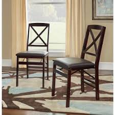 Select Color: 1 available Search for a different item. Upholstered folding dining chairs are available with soft padded seats and backrests covered in premium finishes, such as faux leather, vinyl, and fabric. Choose from a variety of folding chairs with high backs that provide excellent support. Made from engineered solid hardwood, our foldable dining chairs with steel-folding mechanisms are durable and sturdy. Truck & Tool Rental The Home Depot Logo DIY Projects & Ideas Flooring & Area Rugs Lighting & Ceiling Fans Triena Espresso Folding Chair Stylish seating with the convenience of a folding chair. This pair of folding chairs adds an extra dash of elegance for dining or entertaining. The wood frames feature a classic X back and a wipe clean, vinyl padded seat with the appearance of leather and a rich espresso finish. Front and rear supports provide extra stability. The space saving chairs fold for easy set up and storage. Dark brown vinyl padded seat